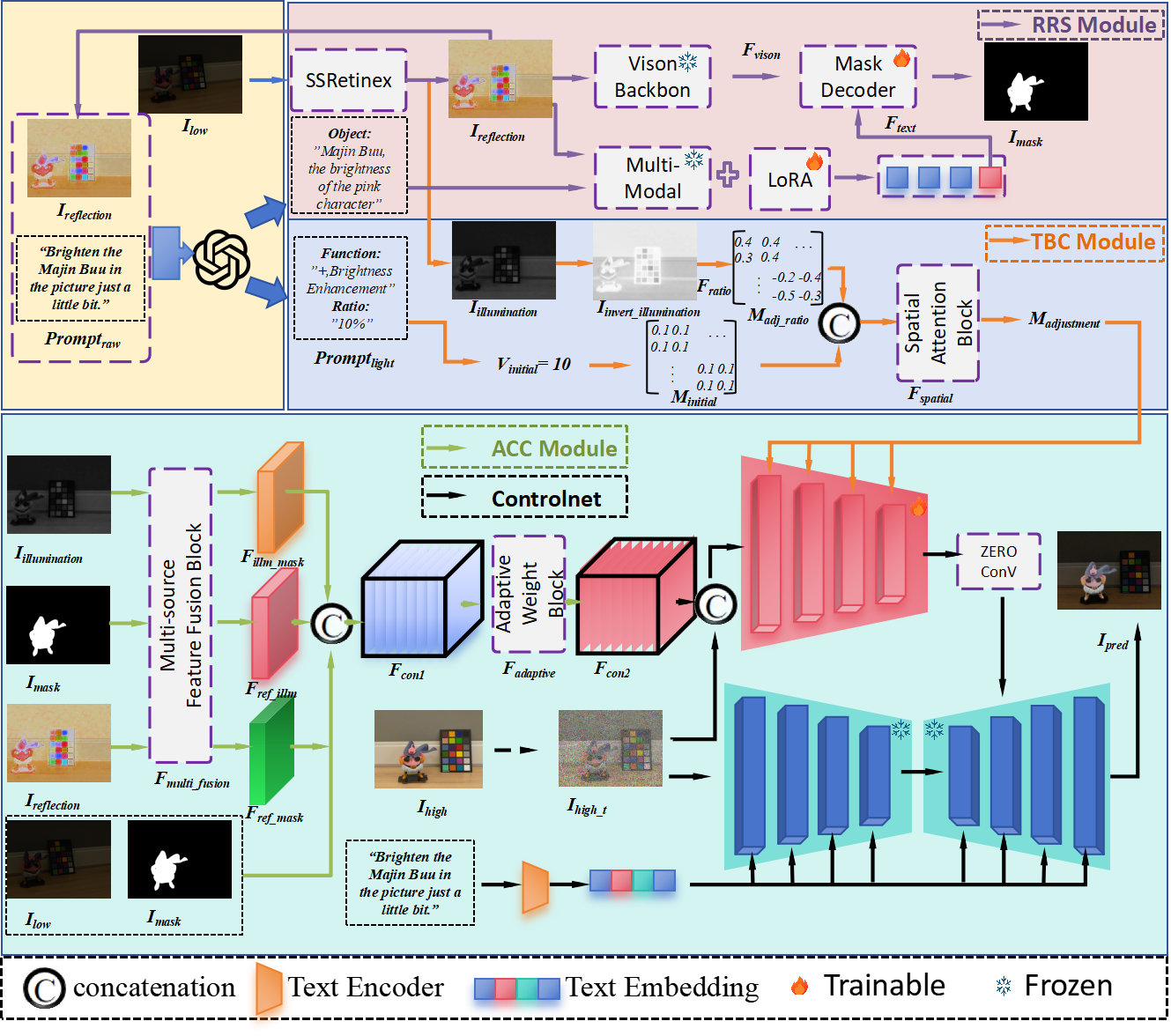 Low-light image enhancement through deep learning can improve noise reduction and visibility. However, existing methods often lack the ability to perform semantic-level, quantitative brightness adjustments, limiting their capacity for personalized lighting control. To address these limitations, we propose a novel framework that utilizes Large Language Model (LLM) capable of interpreting natural language prompt to identify target objects and specify brightness modifications. The framework then employs a Retinex-based Reasoning Segment (RRS) module to generate accurate target localization masks. Concurrently, a Text-based Brightness Controllable (TBC) module applies precise brightness adjustments based on the natural language input. To ensure seamless integration of these components, we introduce an Adaptive Contextual Compensation (ACC) module, which synthesizes multi-source input conditions, guiding a conditional diffusion model to perform accurate lighting adjustments while maintaining overall image coherence. Experimental results on benchmark datasets demonstrate the system's superior performance in enhancing visibility, maintaining natural color balance, and amplifying fine details without introducing artifacts. Our framework also exhibits strong generalization capabilities, enabling complex, semantic-level and personalized lighting adjustments through natural language interactions across various scenarios.